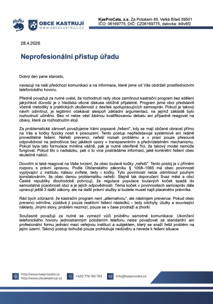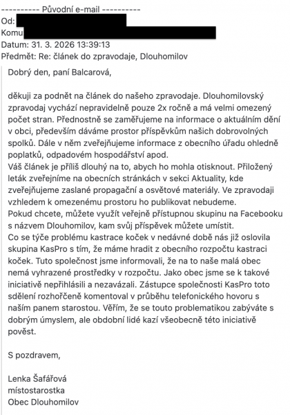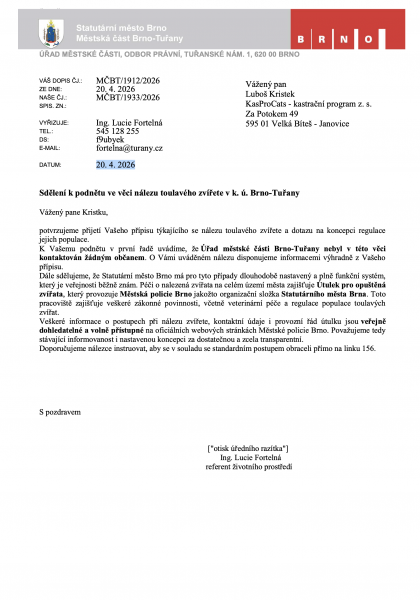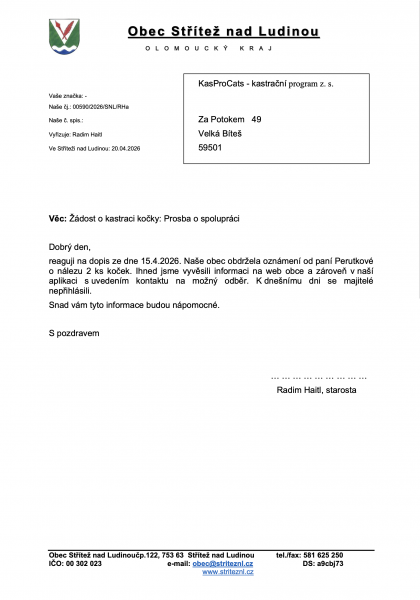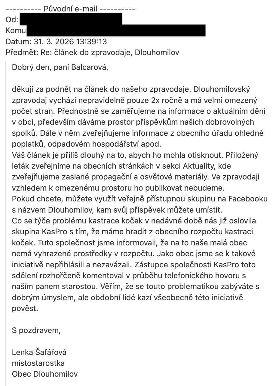 Dejte vědět obecním úřadům, že vás problematika toulavých koček a její prevence zajímá. Prostřednictvím vašeho podpisu tvoříte poptávku, o které se úředníci domnívají, že neexistuje a proto nepovažují toto téma za důležité. Podepište, prosím, naši výzvu směřovanou lokálním úřeníkům a komunálním politikům: